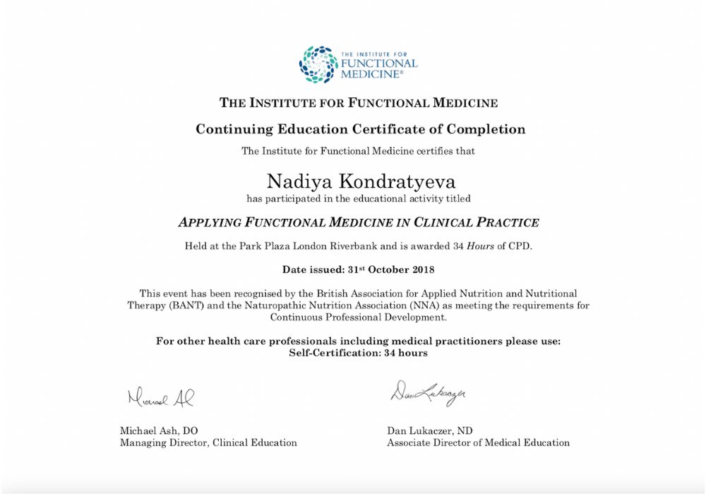 Засновниця центру Нутриціології та Функціональної Медицини – Кондратьєва Надія Олександрівна, яка понад 15 років консультує, навчає та надихає клієнтів вести здоровий спосіб життя. Її багаторічний досвід та навчання у сфері нутриціології та альтернативної медицини у найкращих освітніх закладах Англії та Америки сформували базу знань, яка використовується при побудові всіх персональних оздоровчих програм.