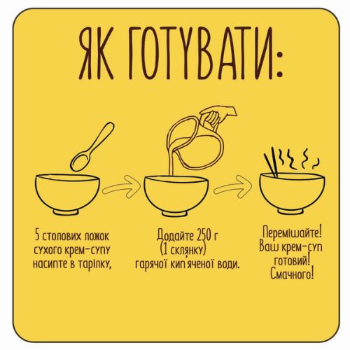 Упаковка крем-супу виготовлена із екологічних матеріалів, придатних для вторинної переробки. Завдяки продуманій конструкції, в ній можна зберігати залишки супу довгий час. 250 грамів сухої речовини розраховані на 5 повноцінних порцій супу і дозволять вам цілий тиждень насолоджуватись смачними обідами на роботі чи вдома.