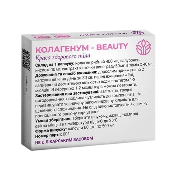Колаген – це природна сполука, що утворюється в нашому тілі з певних амінокислот. Він відповідає за пружність шкіри, гарний вигляд волосся і нігтів, міцність суглобових з’єднань. На жаль, з часом, ефективність вироблення колагену знижується. Щоб підтримувати належний рівень сполуки, важливо використовувати біологічно-активні добавки. Колагенум Beauty від Рослина Карпат – комплексний засіб на рослинній основі, що містить морський колаген. Його регулярний прийом омолодить ваш організм, дозволить мати гарний вигляд і вільно рухатись без болю.