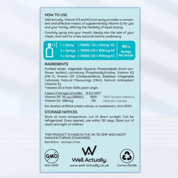 Спрей Well.Actually містить 1000–3000 МО вітаміну D3 у поєднанні з оптимальною дозою K2 (MK-7, форма з найкращою біодоступністю). Це означає, що навіть у холодні місяці року, коли синтез D3 в шкірі знижується, ваш організм отримує необхідну підтримку.