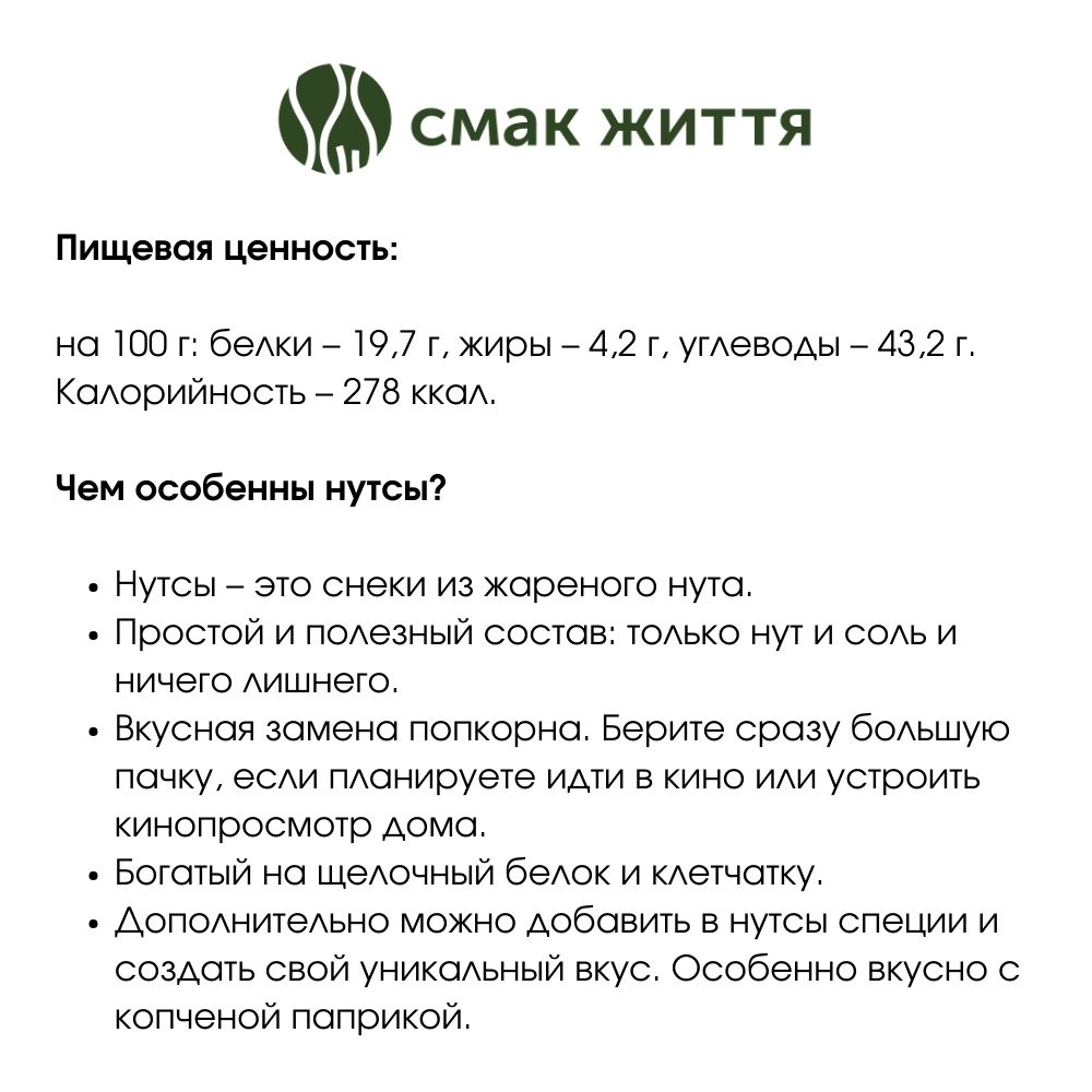 Нутсы от Смак Життя изготовляют из чистого нута и соли, без примесей, красителей или ароматизаторов. Эти вкусности чрезвычайно богаты полезными микроэлементами, ведь нут, или турецкий горох — это кладезь питательных элементов.